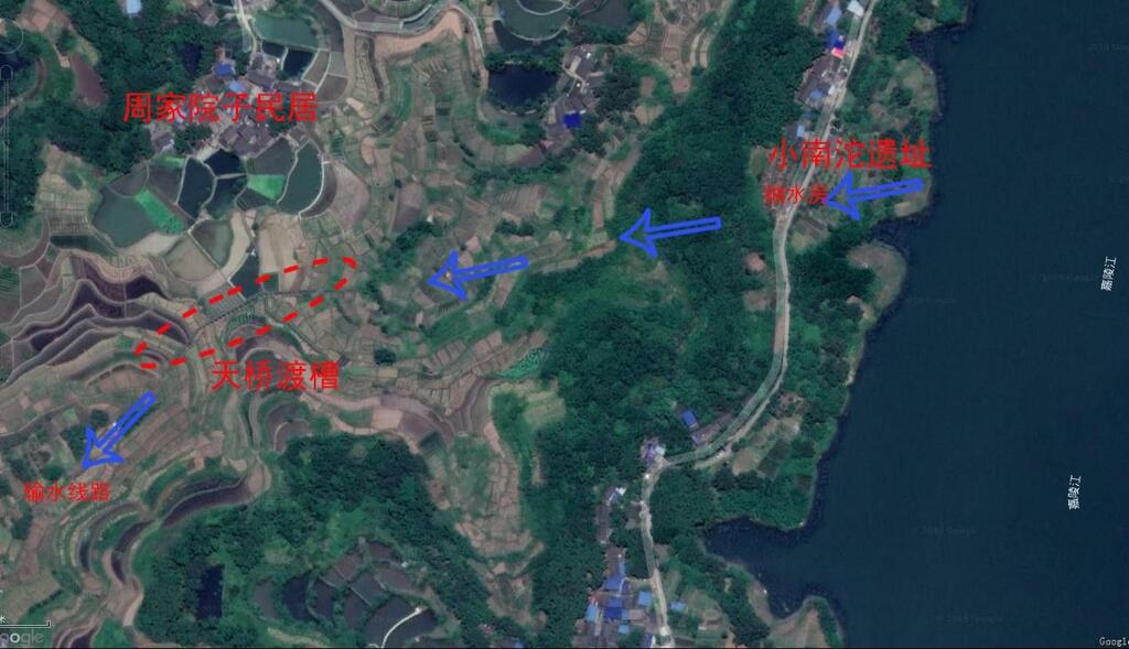 调查队在利用奥维地图软件内进行虚拟调查时,发现佛耳村3社周家院子民居南侧梯田中部有一处疑似渡槽的遗迹,该“渡槽”横跨东西两侧浅丘,东邻嘉陵江,西面为农田。经过实地调查,在小南沱遗址内,发现了该渡槽附属的抽水房、水渠等设施,结合对渡槽本体的现场确认,大致复原了其输水线路。
