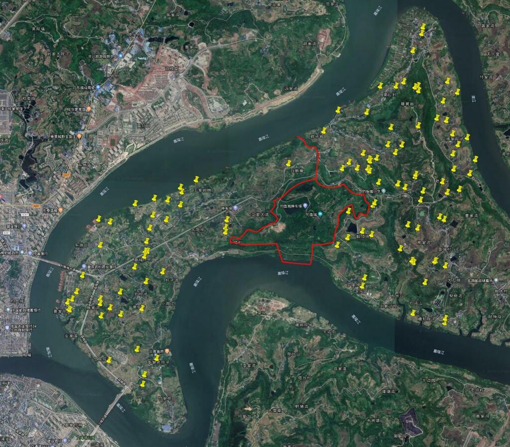 钓鱼城半岛新发现文物点分布图(红色部分为钓鱼城遗址重点保护范围)