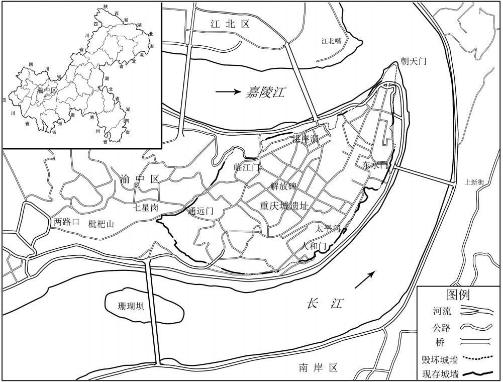 重庆古城位于今重庆市渝中区,地处嘉陵江与长江交汇的半岛尖端,三面环江,西面接陆(图一)。西侧陆路鹅岭陡狭,两江紧束,鹅岭以西佛图关高踞山脊,形势险要,为重庆城的重要门户。《读史方舆纪要》载:“府会川蜀之众水,控瞿塘之上游,临驭蛮剪,地形险要”,历为兵家必争之地。自巴人据此为都以来,历代皆以此天险为城。周慎靓王五年(公元前316年),秦灭蜀国、巴国,占领江州后,秦国丞相张仪于此筑江州城,《华阳国志》云“仪城江州”,成为文献所载重庆城最早的筑城记录。蜀汉建兴四年(226年)江州都护李严自永安还住江州,修筑江州大城,《华阳国志》载:“后都护李严更城大城,周迥十六里,欲穿城后山,自汶江(长江)通水入巴江(嘉陵江),使城为洲”。南宋嘉熙四年(1240年),为抵抗蒙古入侵,四川制置副使兼重庆知府彭大雅抢筑重庆城,“为蜀根本”【1】,后成为宋末余玠构筑的川渝山城防御体系的指挥中心。明洪武六年(1373年)重庆卫指挥使戴鼎在旧城基础上重修,正德《四川志》卷一三《重庆府》载:“本府石城,因山为城,低者垒高,曲者补直,洪武初指挥戴鼎重修,高一丈八尺,周围二千一百三十六丈”,形成九开八闭十七门的城垣格局。历经明中后期至清初的多次补筑,形成了“周二千六百六十丈七尺”的城垣布局。此后,因灾害及自然坍塌重庆古城垣又经过了多次补修,直至民国时期城市拓展时被拆毁或填埋,逐步退出历史舞台。