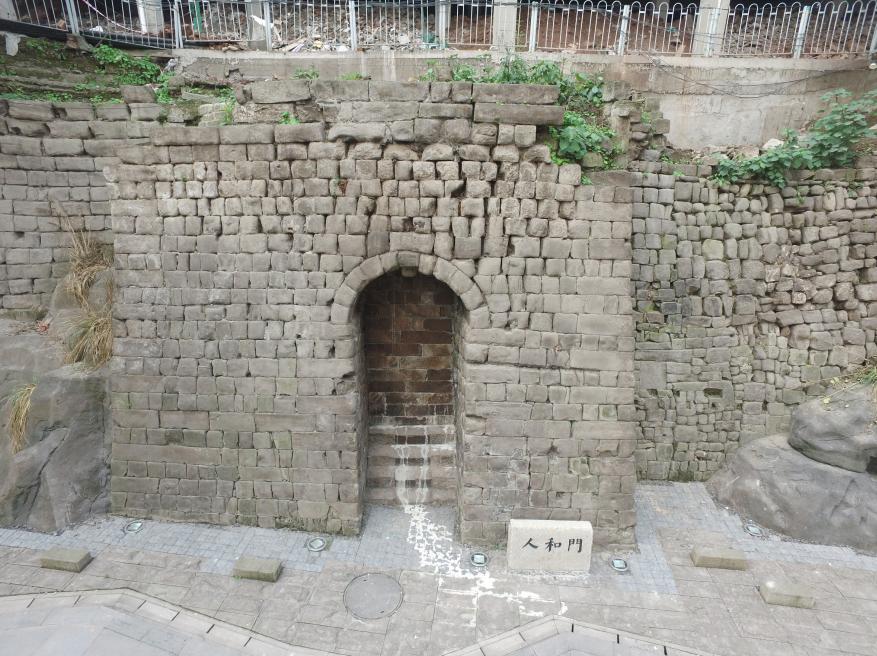 1座,人和门。位于渝中区望龙门街道邮政局巷41号西侧。地理坐标为N29°33′13.11″,E106°34′34.15″,海拔184〜193米。亦称仁和门。夯土甃石结构,包石墙体以错缝丁砌为主,少量为顺砌,白灰勾缝。城门两侧墙体向外伸出形成城台,城台伸出城墙约2.4米。城台用宽约0.3〜0.35、0.24〜0.35米的条石砌筑而成,立面呈梯形,顶端面阔8.6、底端面阔9.22米,残高约7.18米。城门洞为拱券式,一券,无伏。门洞宽1.78、高4.34米。门洞内侧被封堵,内部结构不明(图版三)。