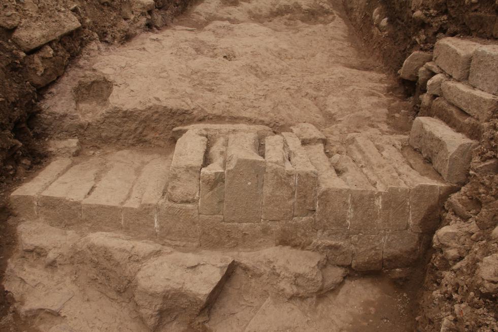城墙呈东南〜西北向,构筑于原生砂岩之上,砌筑方法主要分为两类,上部用长约70、高35厘米的长方形条石错缝顺砌,下部用宽、高约22厘米的方形条石错缝丁砌。